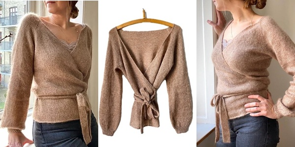 Женственная кофта с запахом, связанная сверху вниз, с регланом и неброскими воздушными рукавами-фонариками от Refined Knitwear.